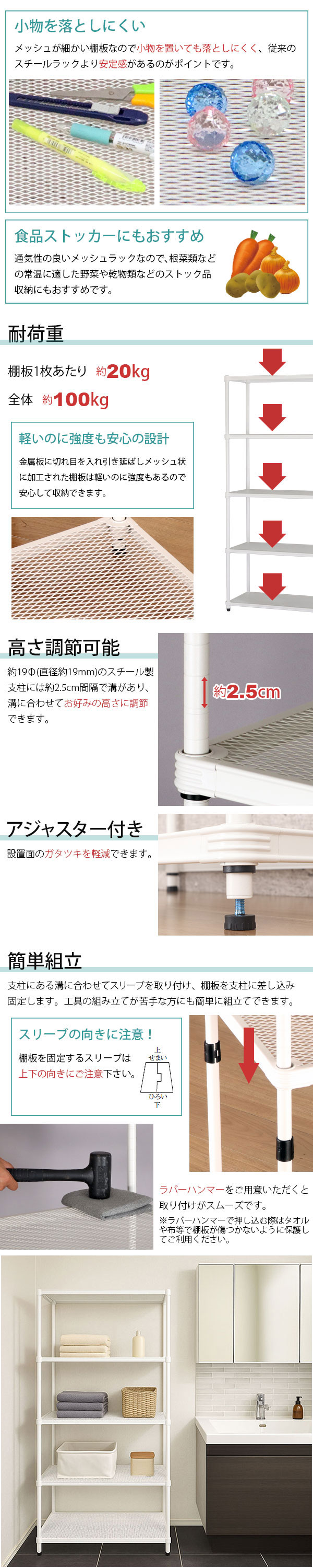 湿気に強い どんな空間にも馴染む メッシュ素材 メッシュ仕様の棚板 ホコリが溜まりにくい 湿気がこもりにくい 網目が細かい 文具 アクセサリー 細かな物も置ける 奥行スリム 部屋を圧迫しない ナチュラル 棚板可動式 自由にカスタマイズ 高さ調整可能 スチールフレーム 日常使い 重めの収納 簡単に組み立てられる 圧迫感がない 狭いスペースにもぴったり 自由に高さ調整できる キッチンアイテム 観葉植物