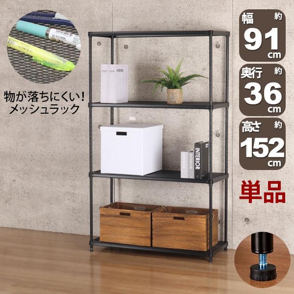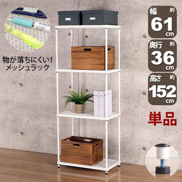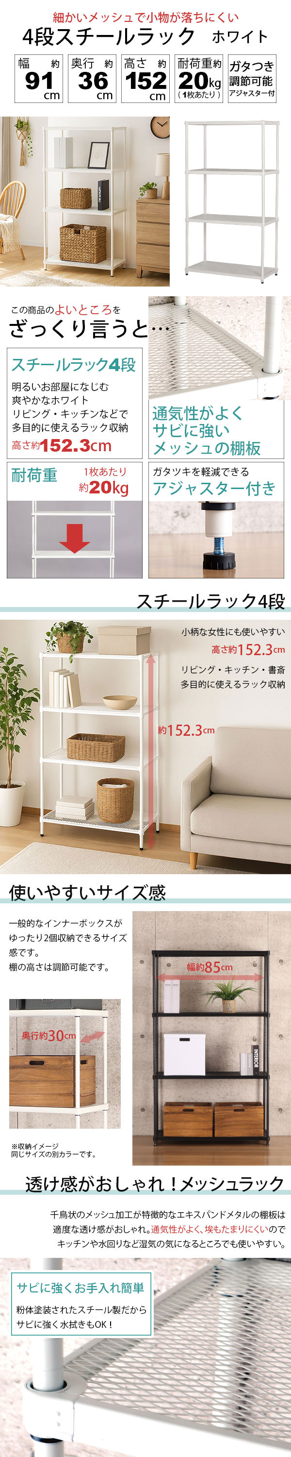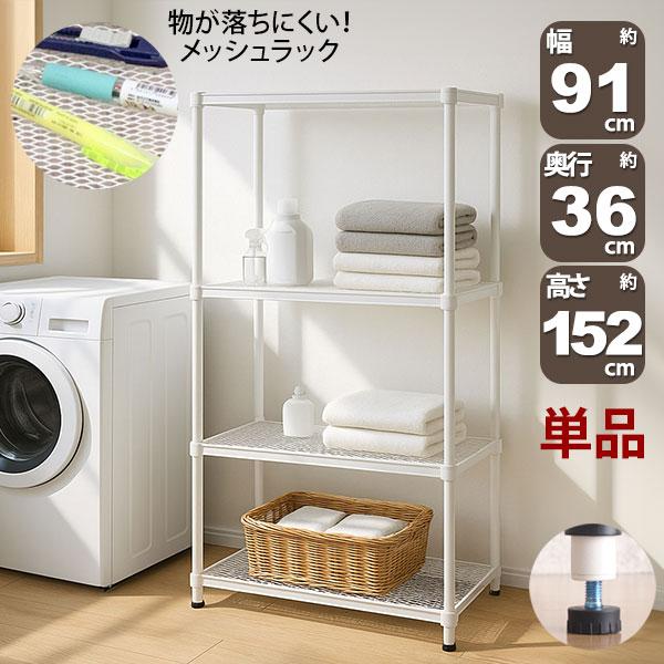 物が落ちにくい スチールラック 4段 (約)幅90cm 奥行35cm 高さ152cm メッシュ棚板 収納棚 スリム メッシュラック ホワイト 白 おしゃれ 頑丈 棚板耐荷重20kg オープンラック 隙間収納 キッチンラック ランドリー収納 高さが変えられる棚 アジャスター付き 1個単品 EPR-9015