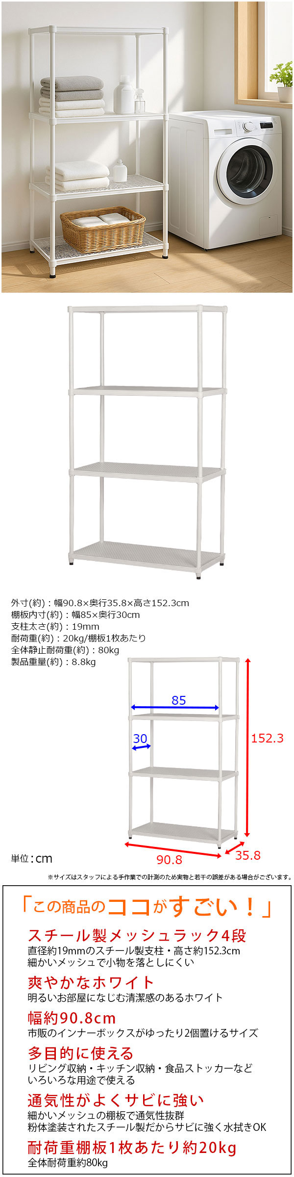 商品名:物が落ちにくい スチールラック 4段 (約)幅90cm 奥行35cm 高さ152cm メッシュ棚板 収納棚 スリム メッシュラック ホワイト 白 おしゃれ 頑丈 棚板耐荷重20kg オープンラック 隙間収納 キッチンラック ランドリー収納 高さが変えられる棚 アジャスター付き 1個単品 EPR-9015 家具 インテリア 収納家具 棚 収納ラック メッシュ 棚 網目 高さ調整 五段ラック マルチラック フリーラック 多目的ラック 整理棚 オープン棚 オープンシェルフ スチールシェルフ 物が倒れにくい スリムラック キッチン収納棚 レンジ台 レンジラック 家電収納 キッチンストッカー リビング収納 玄関ラック 玄関収納 ランドリーラック 洗剤収納 洗剤 ストック プリンターラック プリンター台 本棚 ディスプレイラック 飾り棚 コレクションラック 小物収納 おもちゃ 雑貨 フラワースタンド 花台 プランターラック サイドラック コンパクト 省スペース 丈夫 シンプル モダン スタイリッシュ かっこいい 新生活 一人暮らし ワンルーム キッチン 台所 居間 ダイニング 子供部屋 洗面所 脱衣所 サニタリー クローゼット 押し入れ パントリー 納戸 物置 倉庫 ガレージ すっきり 片付け 組立簡単 通気性 可動棚 ポール径19mm ガタツキ防止 マット加工 マットホワイト 白い棚