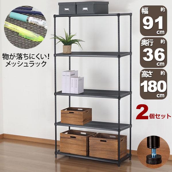 2個セット 物が落ちにくい スチールラック 5段 (約)幅90cm 奥行35cm 高さ180cm メッシュ棚板 収納棚 スリム メッシュラック ブラック 黒 おしゃれ 頑丈 棚板耐荷重20kg オープンラック 隙間収納 キッチンラック ガレージ 高さが変えられる棚 アジャスター付き EPR-9018
