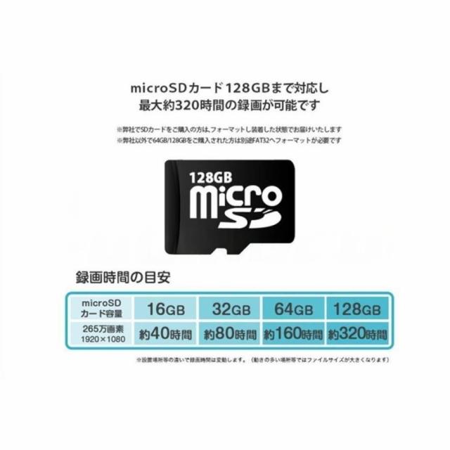 ・microSDカードで最大128GB(約320時間)の録画が可能