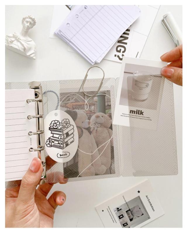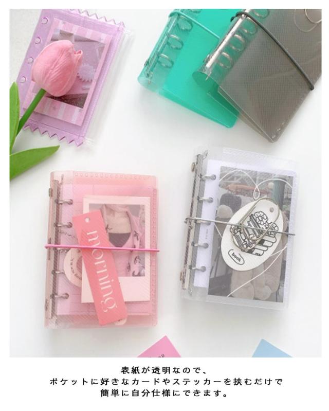 | ポケットリフィルが10枚付! 【バインダー帳】 表紙が3つ折り&ポケットバインダーになっているM5サイズのバインダーファイル。 裏表にポケットのあるリフィルが10枚付属! 表紙が透明なので、ポケットに好きなカードやステッカーを挟むだけで簡単に自分仕様にできます。 可愛い大きめクリップも1つ付属♪ 推しカラーに合わせて5色から選ぶのもおすすめです! | |