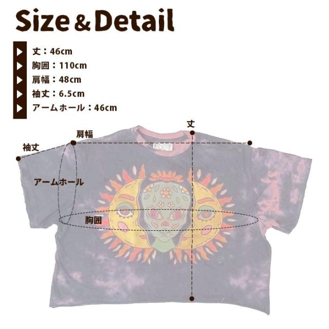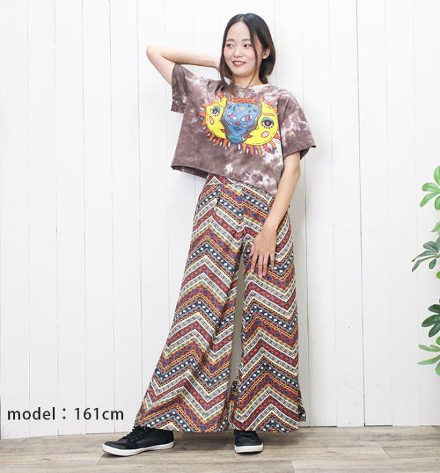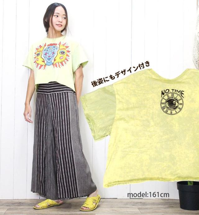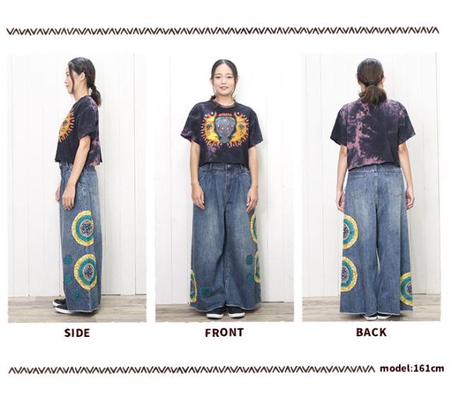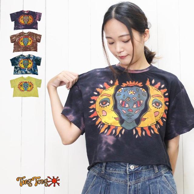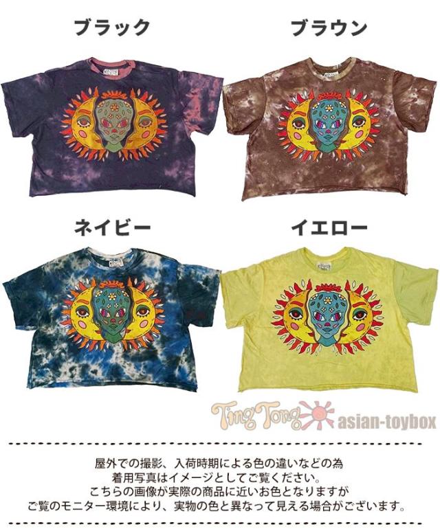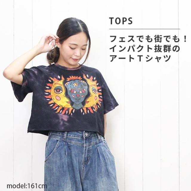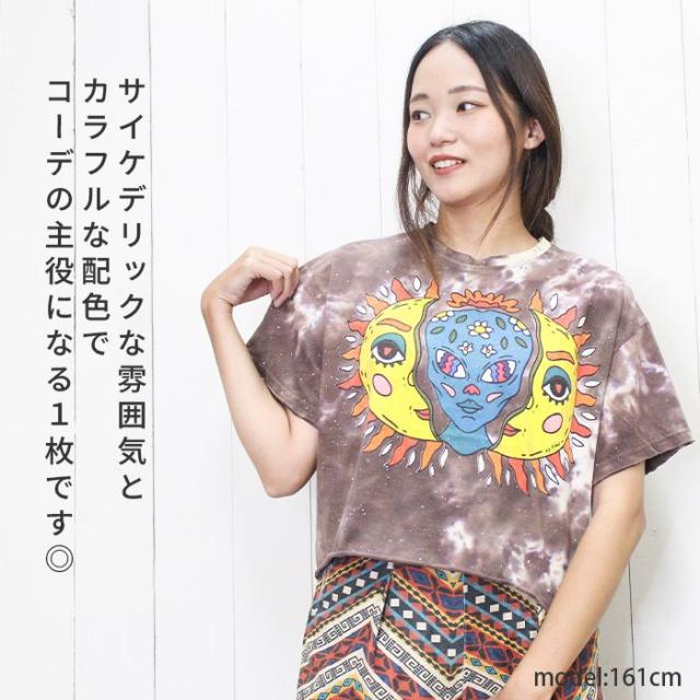 Tシャツ 半袖 レディース プリント ショート丈 クロップド !サン&ムーンアート エスニック ヒッピー サイケ 個性派 綿