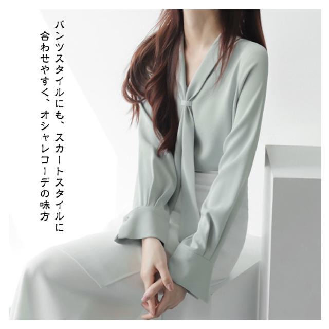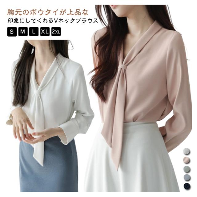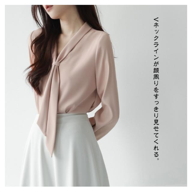 | 胸元のボウタイが上品な印象にしてくれるVネックブラウス ロングタイはリボン結びでも、タイ風に束ねてもOK。気分やシーンに合わせてアレンジできる。 Vネックラインが顔周りをすっきり見せてくれる。 とろんとした素材感が、女性らしい雰囲気を演出。 胸元のリボンがアクセントで、周りと差がつくデザインです! パンツスタイルにも、スカートスタイルに合わせやすく、オシャレコーデの味方 お出かけからオフィスカジュアルまで、普段のコーデに華を添えてくれるアイテムです。 | |