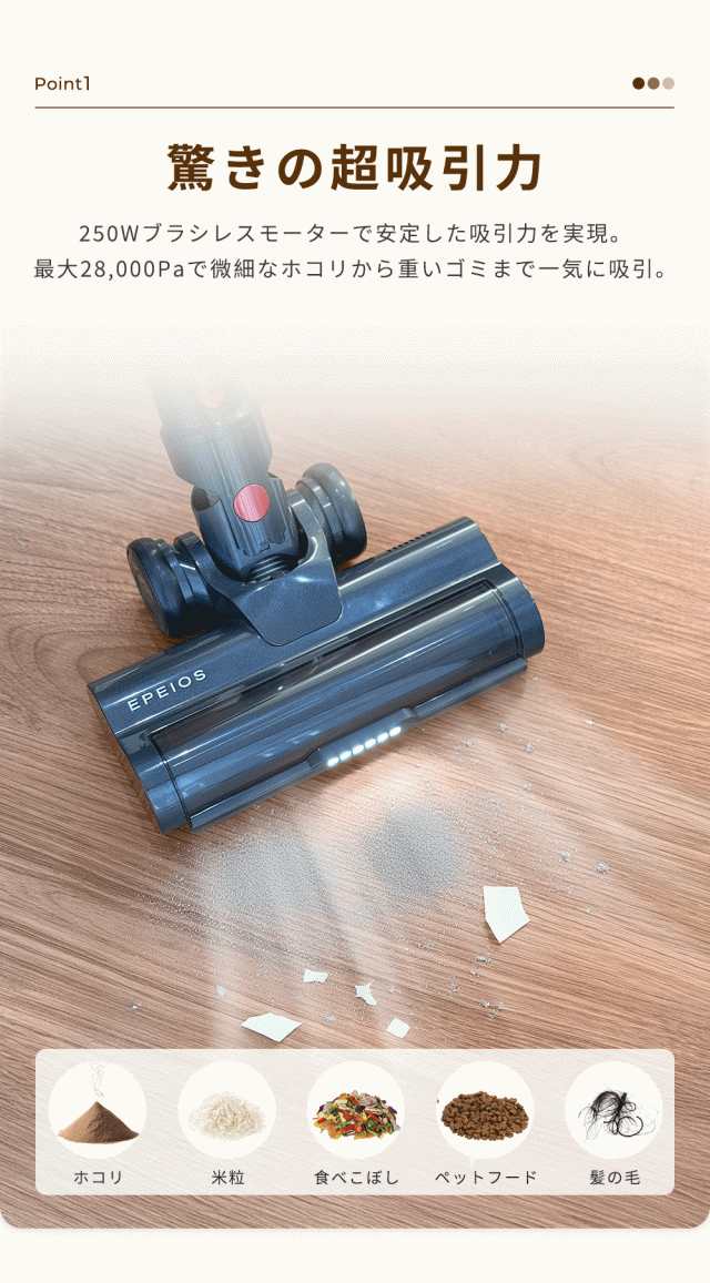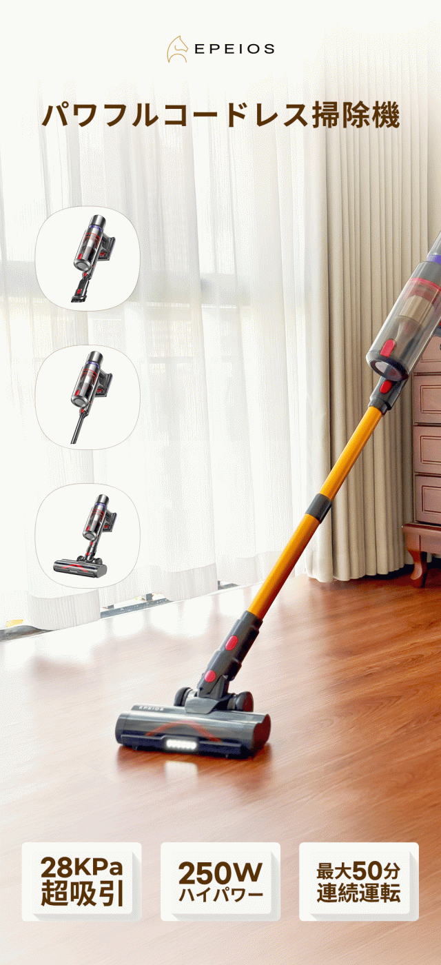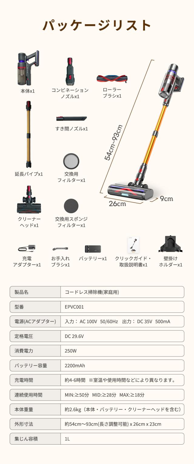 最新掃除機 28Kpa強力吸引 250Wハイパワー 50分連続稼働 LEDライト付 コードレス掃除機 サイクロン式 LCD液晶ディスプレイ HEPA 4層濾過 1L大容量 自立式 着脱式バッテリー 左右180°上下90° EPEIOS