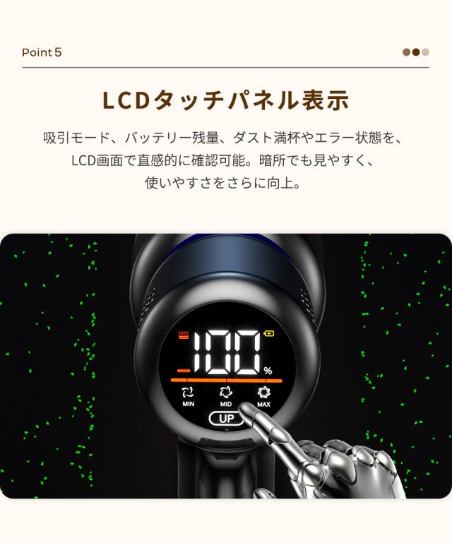 表示:LCDディスプレイ(残量%/モード/エラー)