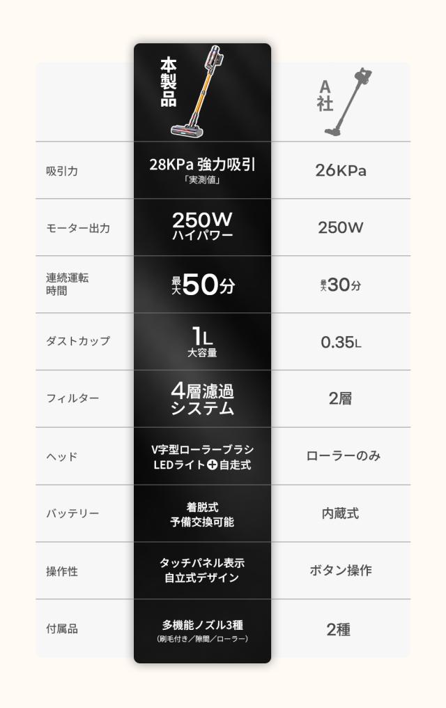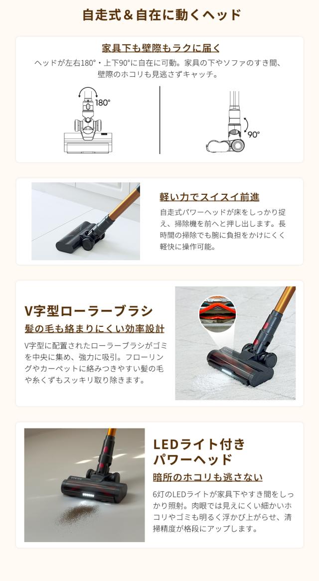 クリーナーヘッド:V字型ローラーブラシ+自走式+LEDライト