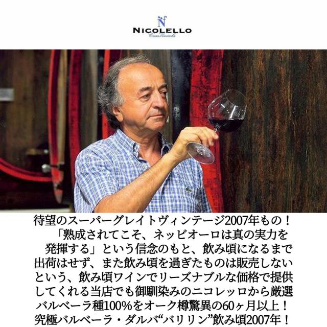 待望のスーパーグレイトヴィンテージ2007年もの! 「熟成されてこそ、ネッビオーロは真の実力を 発揮する」という信念のもと、飲み頃になるまで出荷はせず、また飲み頃を過ぎたものは販売しないという、飲み頃ワインでリーズナブルな価格で提供してくれる当店でも御馴染みのニコレッロから厳選バルベーラ種100%をオーク樽驚異の60ヶ月以上!究極バルベーラ・ダルバ“バリリン”飲み頃2007年!