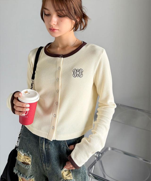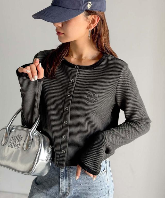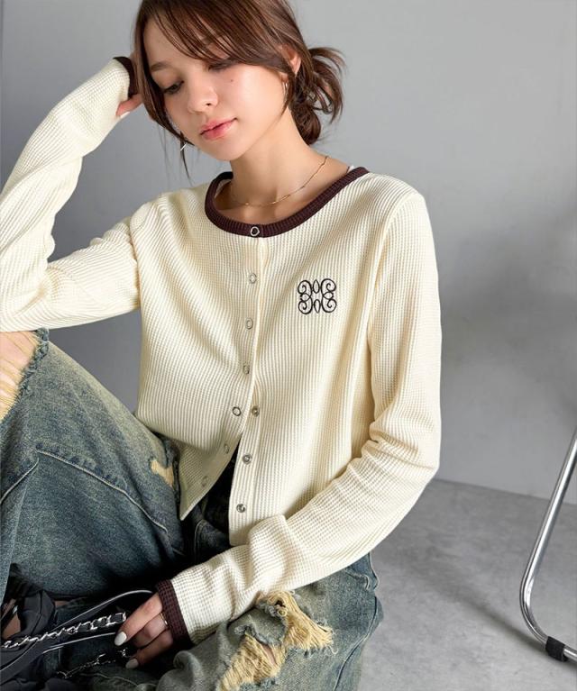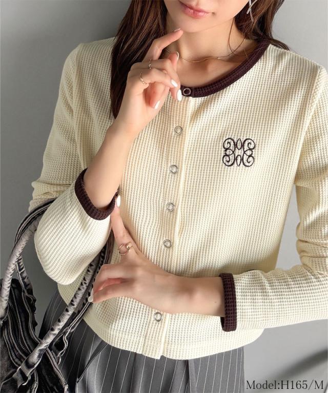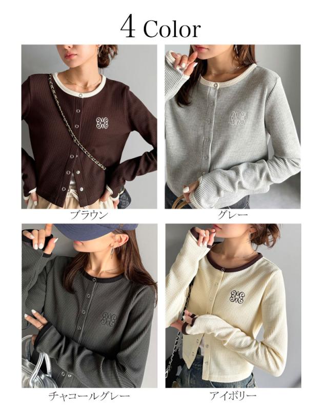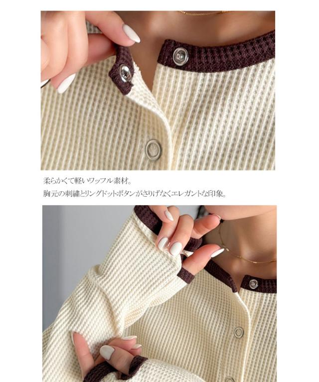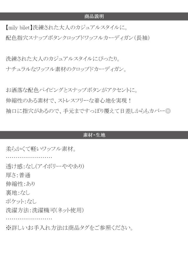 クラシカルエルフ秋新作 mily bilet トップス カーディガン レディース 配色 指穴 スナップ ボタン クロップド ワッフル カーデ 長袖 大きいサイズ 2025aw mi1269012