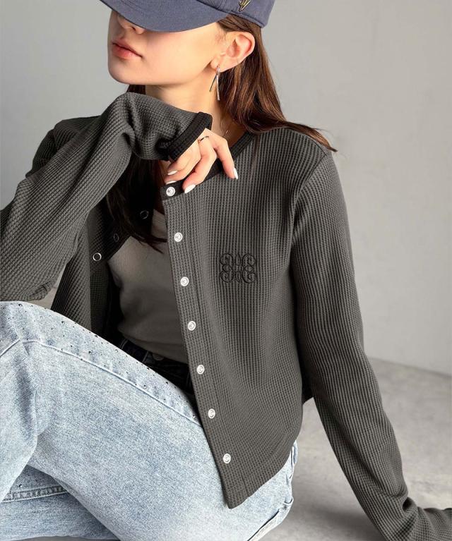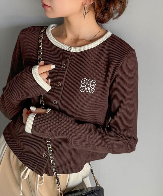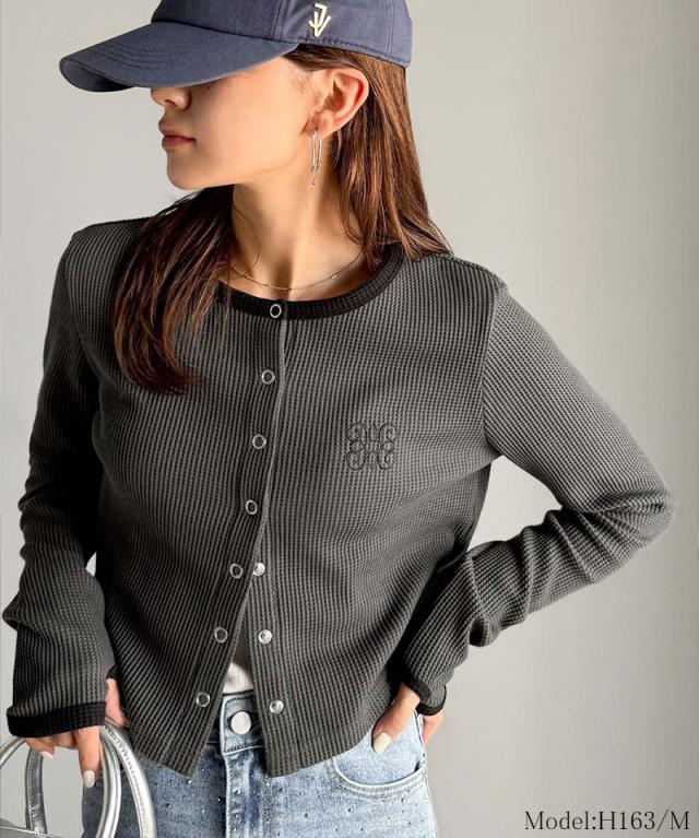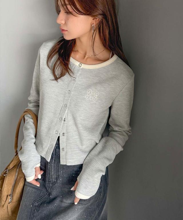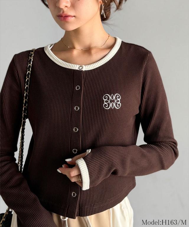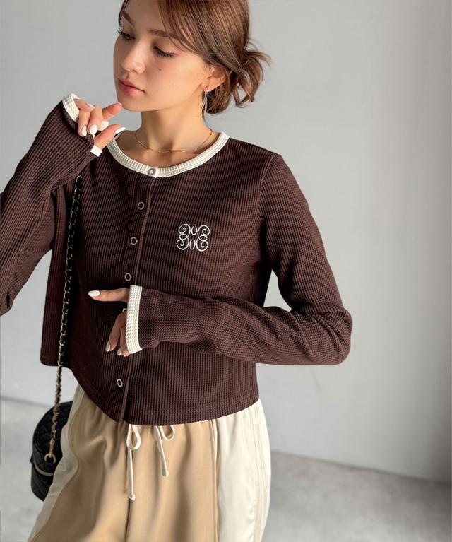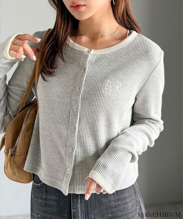 クラシカルエルフ秋新作 mily bilet トップス カーディガン レディース 配色 指穴 スナップ ボタン クロップド ワッフル カーデ 長袖 大きいサイズ 2025aw mi1269012