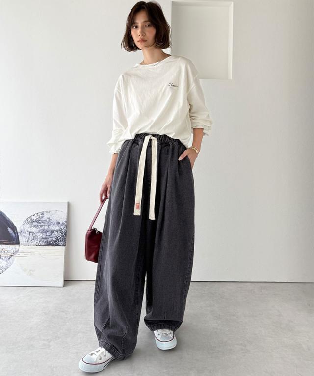 腰回りは程よくゆるく、裾に向かってすっきりまとまるデザインです。