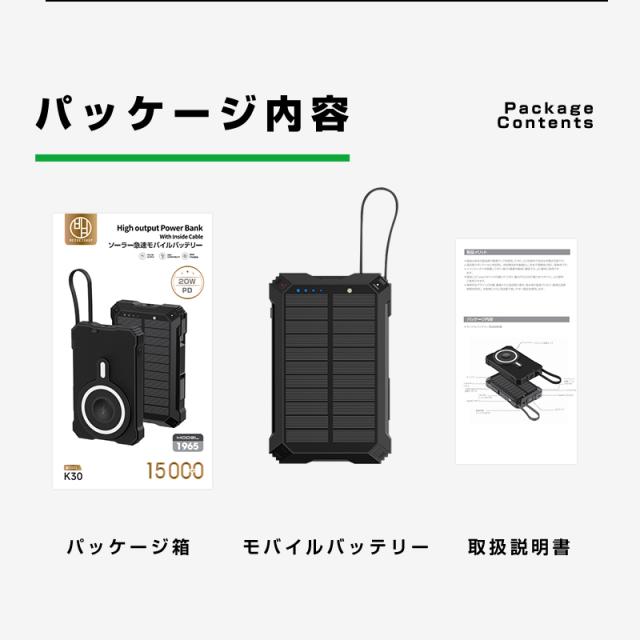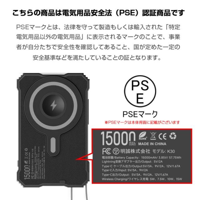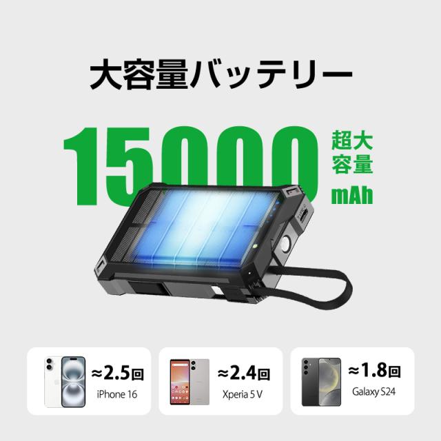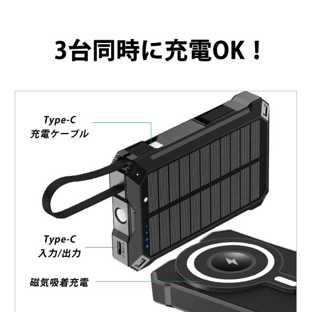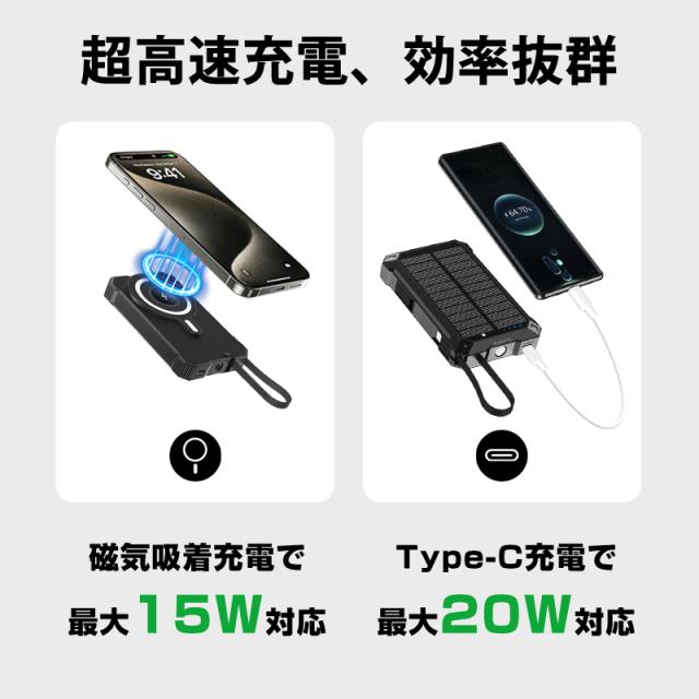 ソーラー充電対応 15000mAh 57.75Wh 大容量モバイルバッテリー MagSafe対応 15Wワイヤレス充電 iPhone 17/iPhone Air充電 iOS/Android対応 LEDライト付き 停電 災害 台風 地震 防災グッズ 便利グッズ コンパクト 軽量 90日安心保証 PSE認証【PL保険加入済み製品・安心】