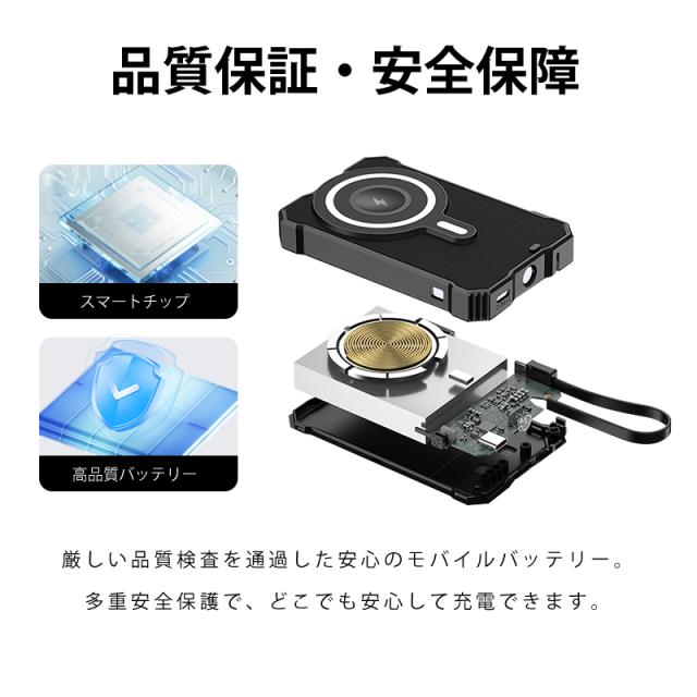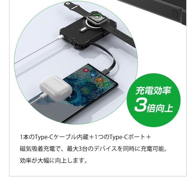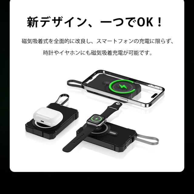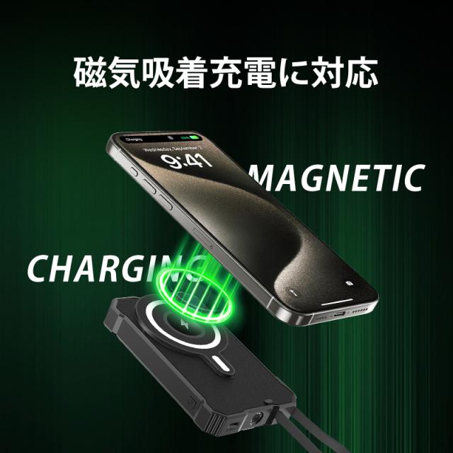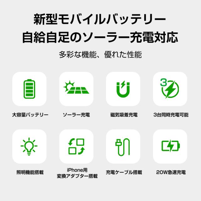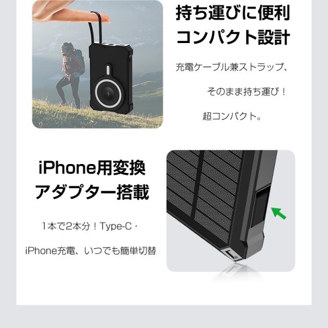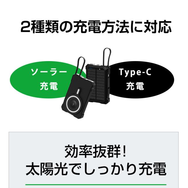 ソーラー充電機能で緊急時の電力確保が可能なだけでなく、強力マグネットによるワイヤレス充電で利便性が大幅に向上しています。iPhone12〜17シリーズをはじめ、様々なQiデバイス(イヤホンやスマートウォッチ等)の充電ニーズに対応します。
