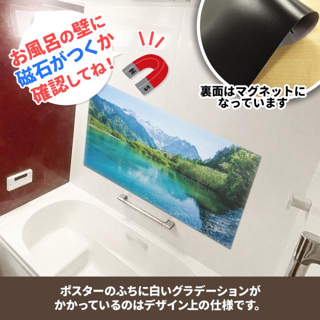 お風呂で使えるマグネット製のポスターです。 ■商品サイズ:約1100×570mm ※本製品はマグネットを使用しています。タイルや木製等、磁石がつかない壁面にはご使用いただけませんので、ご使用になる場所に磁石がつくことをご購入前にご確認ください。 |
