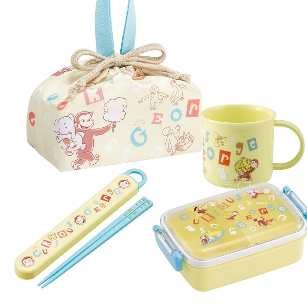 おさるのジョージ アルファベット お買得4点セット 角型お弁当箱 450ml 箸&箸箱 コップ 巾着セット KE4A
