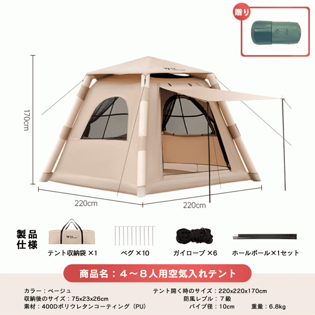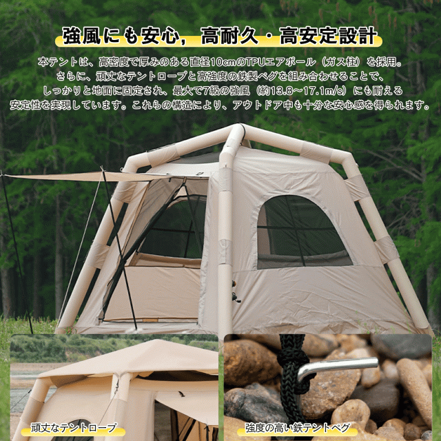 空気を入れるだけで簡単設営&撤収、防風7級で安心!