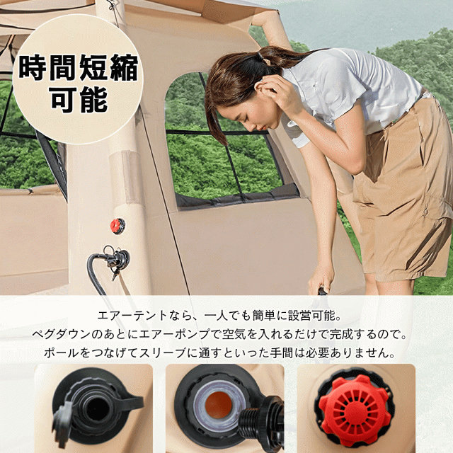【店内全品10%オフクーポン配布中】テント 3〜4人用 キャンプ アウトドア ワンタッチ キャンプ用品 自動 自立式 簡単 ポール一切不要&自動設営 グランピング 大型 エアフレームテントが空気で瞬時に自立、99%UVカット 防水 強風耐性でアウトドアを快適に おしゃれ