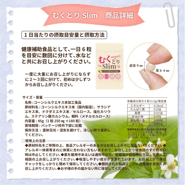 【初回限定】お1人様1個まで【ダイエットサプリ】むくとりslim1袋180粒 サプリメント サラシア・コーンシルク・カリウム・どくだみ ダイエットをサポート!