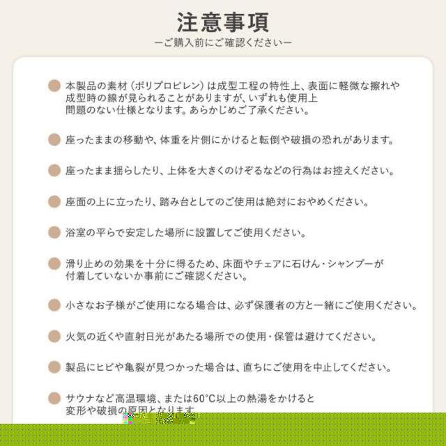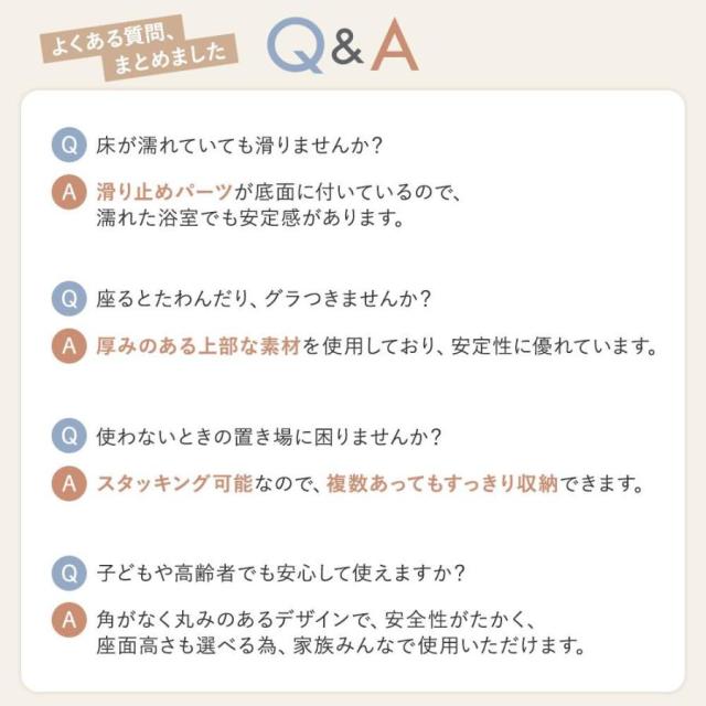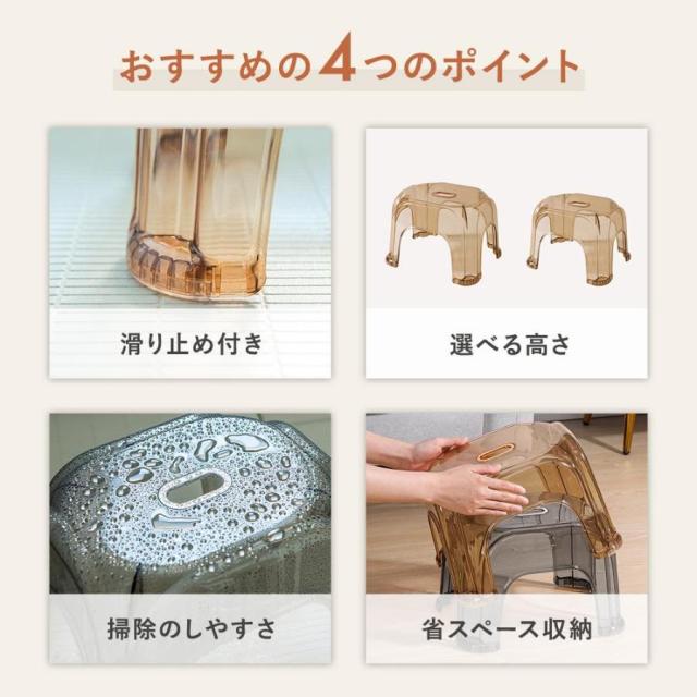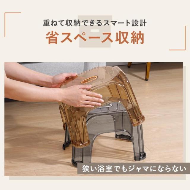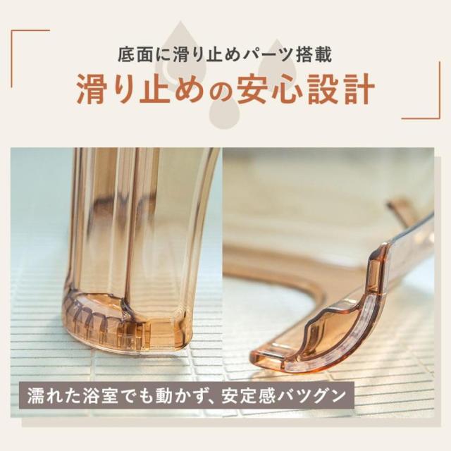 - このバスチェア、透明なデザインがおしゃれで浴室の雰囲気を邪魔しません!滑り止めがしっかりしているので、高齢の母も安心して入浴できています。
