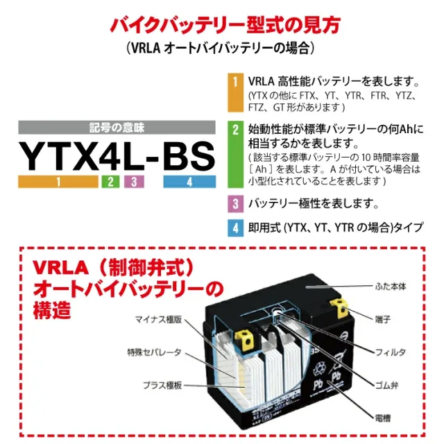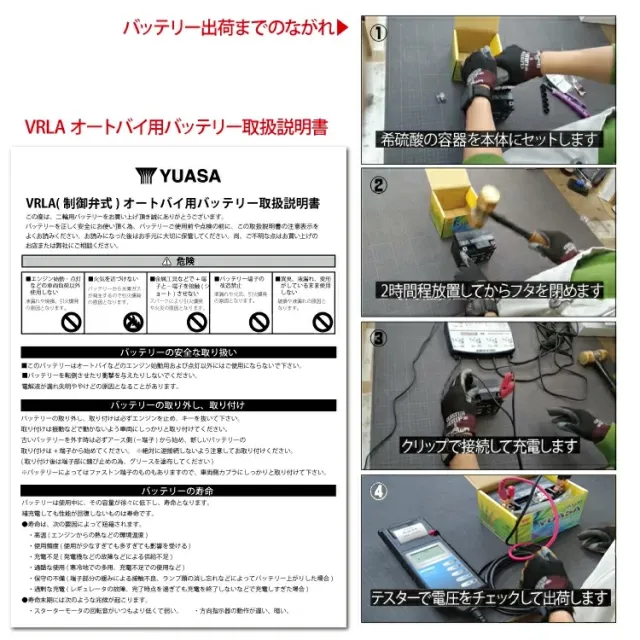 古いバッテリーを車両から外す際は「-(マイナス)端子」から、新しいバッテリーを車両に装着する際は「+(プラス)端子」から接続してください。その他取扱い方を誤ると、車両破損、及び人体への危険も伴いますので、充分にご注意下さい。