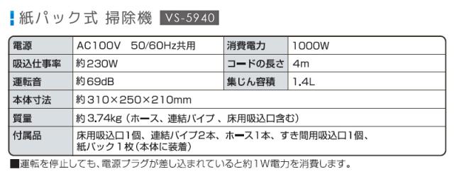 ベルソス 紙パック式 掃除機 VS-5940 紙パック式クリーナー 軽量 キャニスター型 本体スイッチ コード式 吸込仕事率230W スタンド収納