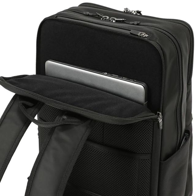 背面側メインルームにはクッション材を内蔵し、PCやタブレットなどの大事な機器を衝撃から守ります。内装は収納物に優しいソフトなパイル生地を使用し、繊細な機器にも配慮しています。(〜15インチPC対応可能、PCクッションルームサイズ:W27cm×H40cm) ※機器の対応サイズ:機器によって入らない可能性がございます。あくまで目安としてお考え下さい。