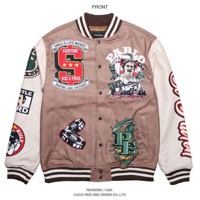 【20%OFF】REASON × Pablo Escobar パブロ・エスコバル アウター 長袖 スタジャン ブルゾン メンズ 茶色 大きいサイズ 限定 コラボ 公式 リーズン 防寒着 Narcos ナルコス ビッグシルエット b系 ヒップホップ ファッション ストリート系 ブランド 服 2025秋冬 RBR51