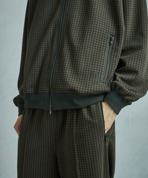 スウェードライクな滑らかなダブルジャージ素材と、凹凸感のあるオリジナルのハウンドトゥース(千鳥格子柄)ジャカードを使用。