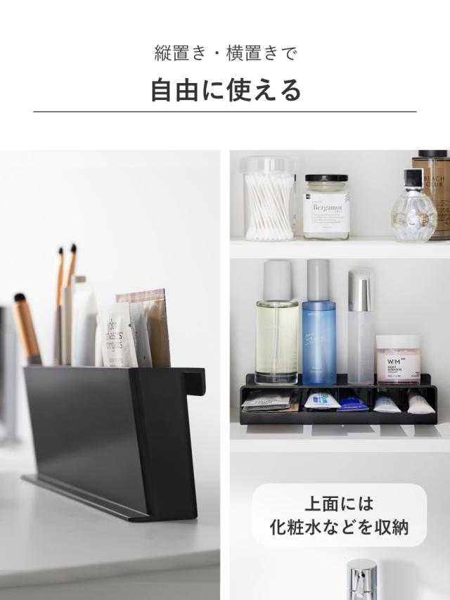 縦置き・横置きどちらでも使えるミニチューブスタンドです。横置きにすれば、仕切り部分にチューブ類を、上面には化粧水やボトルを収納可能です。使う場所や収納スペースに合わせて自由に設置できます。