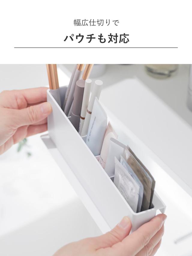 仕切りの一部は幅広タイプ。化粧水などの小分けパウチ類もきれいに収まり、収納の幅が広がります。