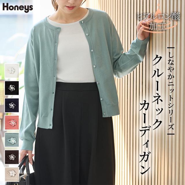 トップス カーディガン 長袖 ヒアルロン酸加工 クルーネック しなやかニット アクリル混 無地 レディース SALE セール Honeys ハニーズ ヒアルロン酸クルーカーデ