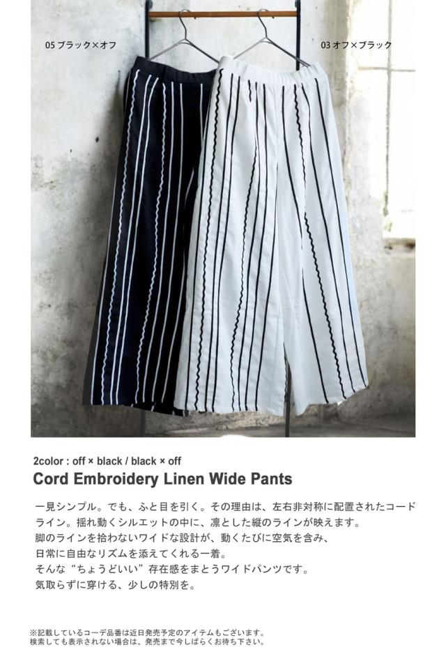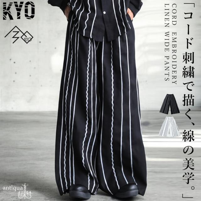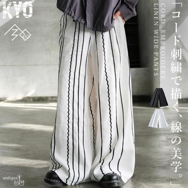 kyo-4017z ロングパンツ 刺繍 コードライン ワイドシルエット 長ズボン リネン混 後ろゴム 前フラット セットアップ ゆったり ポケット付き ベルトループ付き モード ユニセックス