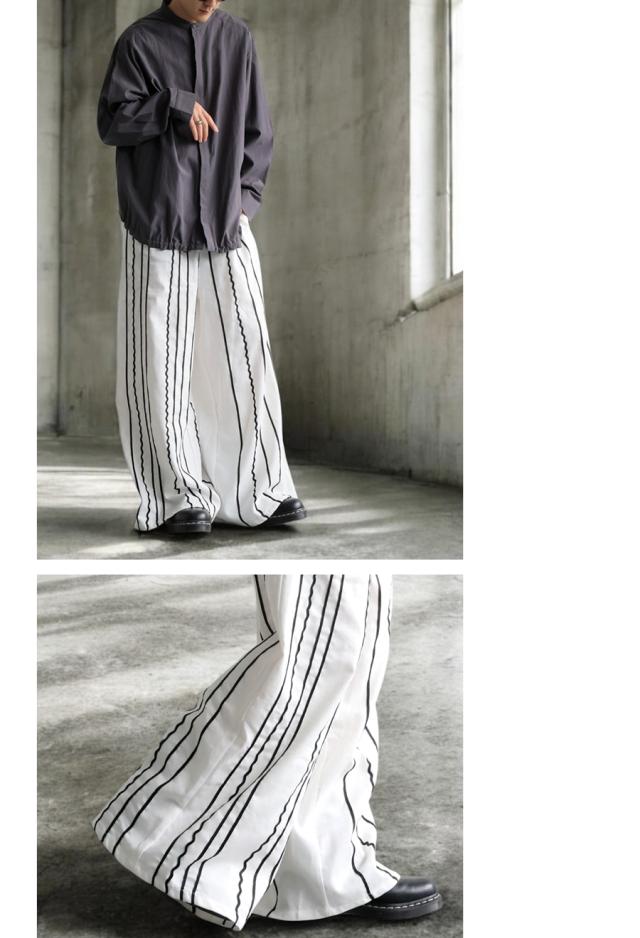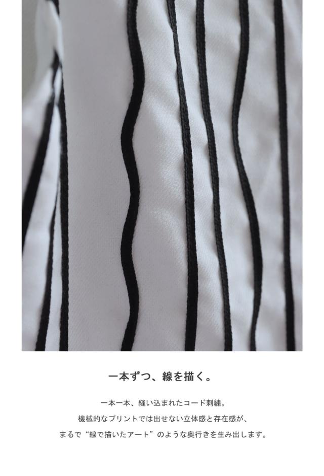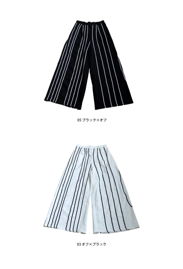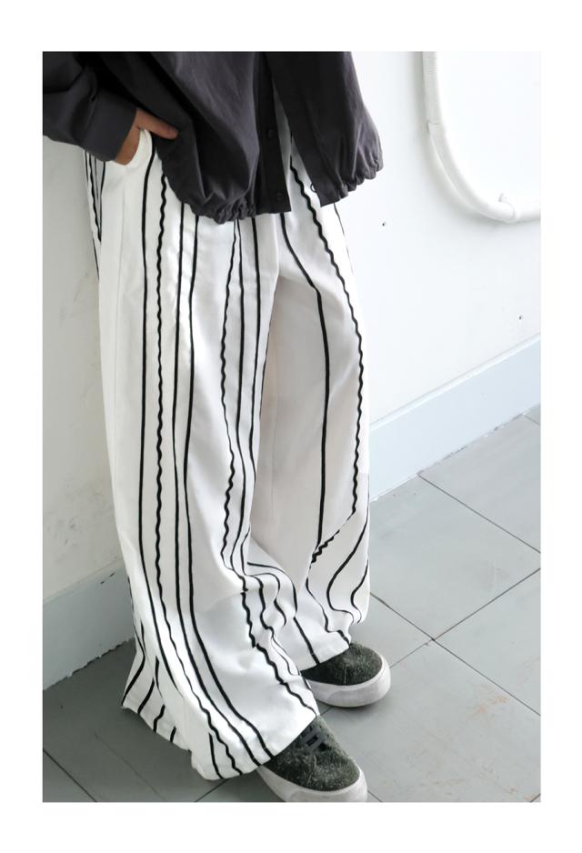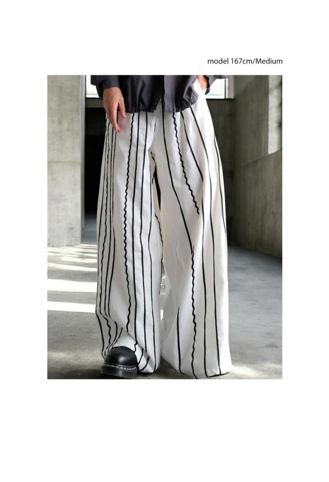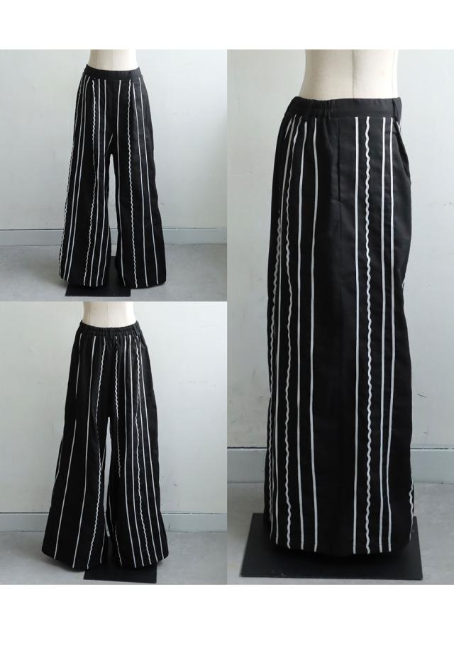 左右非対称に走るコードライン刺繍が際立つ、存在感あふれるロングパンツ。