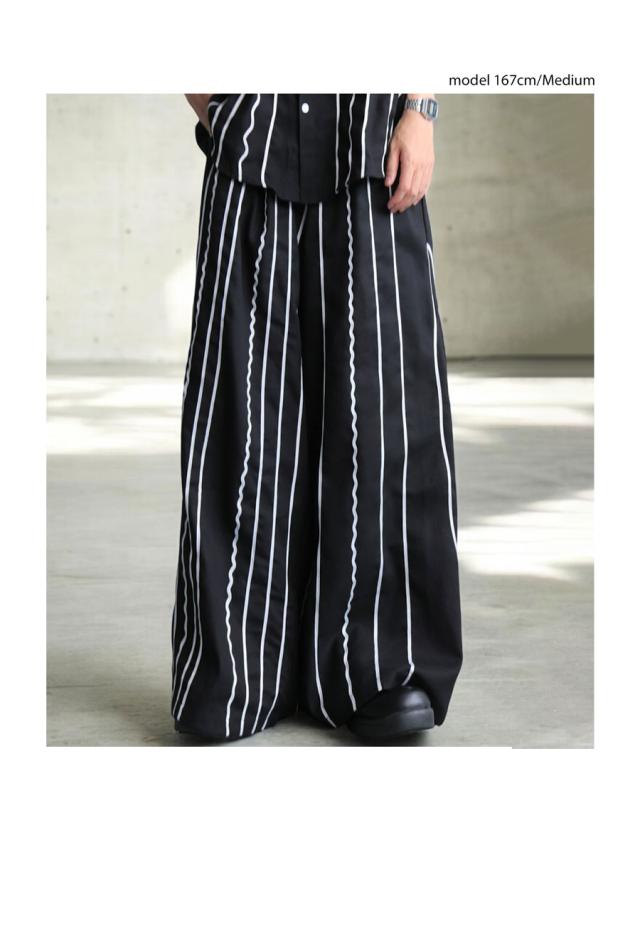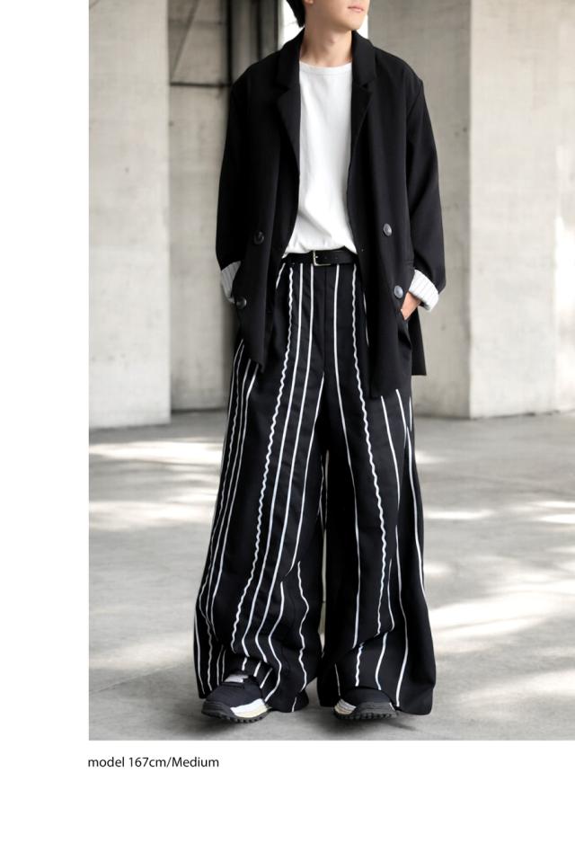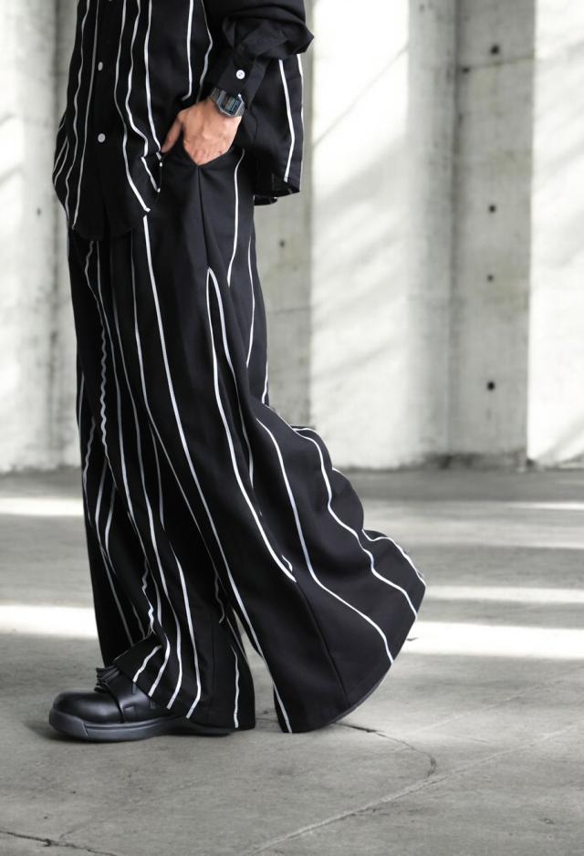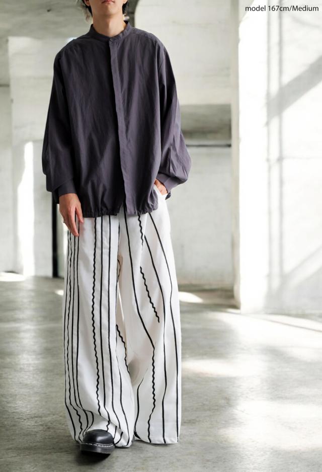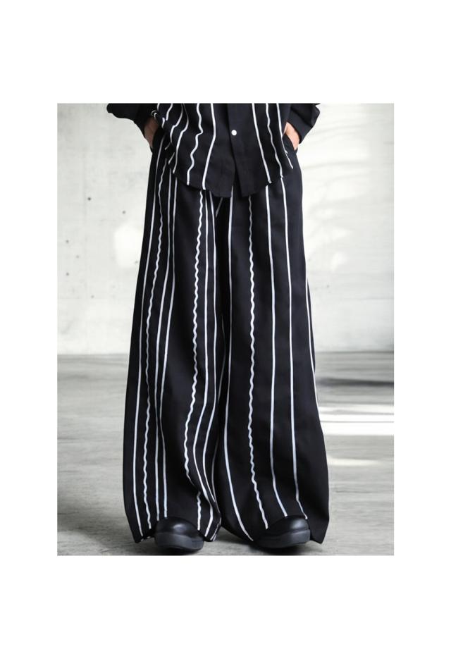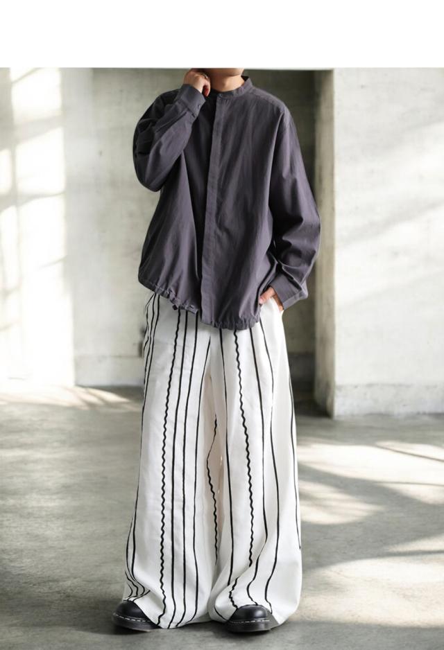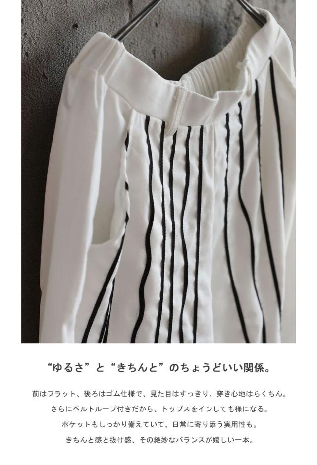 左右非対称に走るコードライン刺繍が際立つ、存在感あふれるロングパンツ。