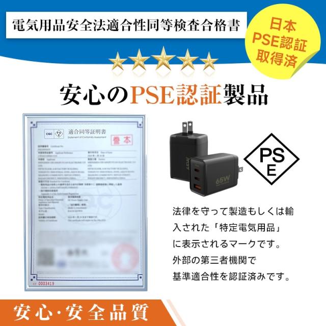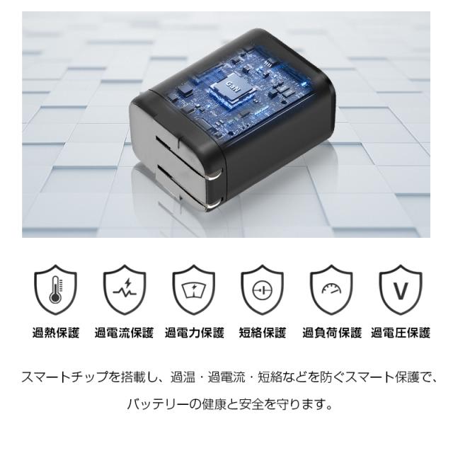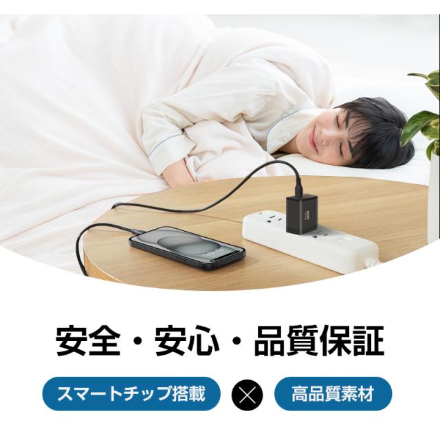 過電流/過電圧/回路ショート/過熱/雷サージなど多種類の安全保護機能を標準装備。充電中の電圧変動をリアルタイム監視する制御ICを搭載し、接続機器と充電器本体の双方を保護します。PSE認証を取得済みで、就寝中の充電や長時間使用でも安心してご利用いただけます。