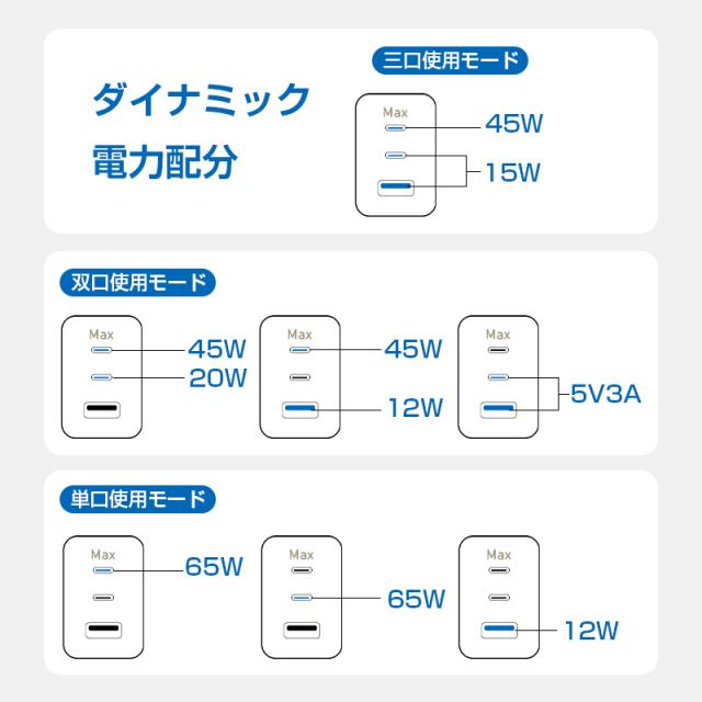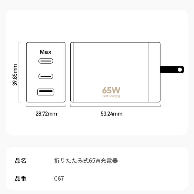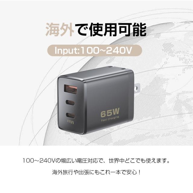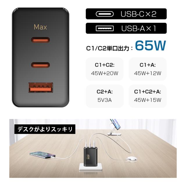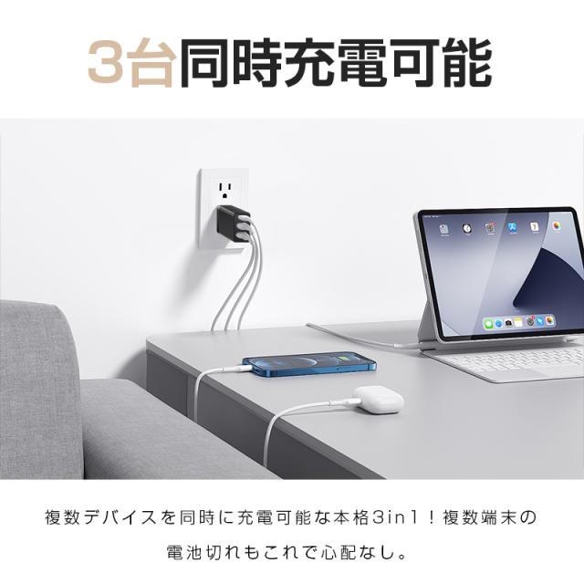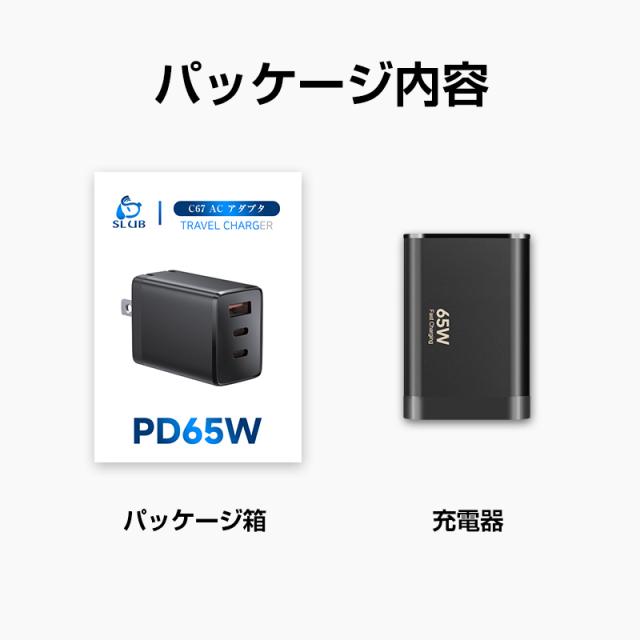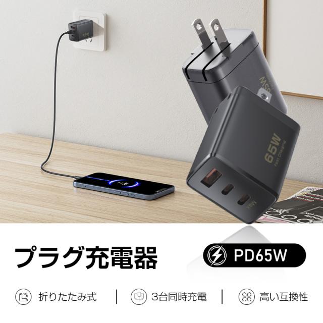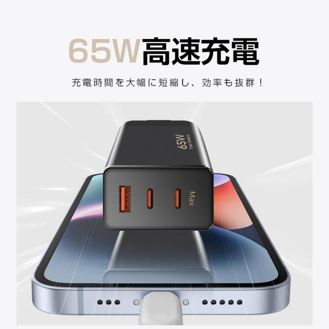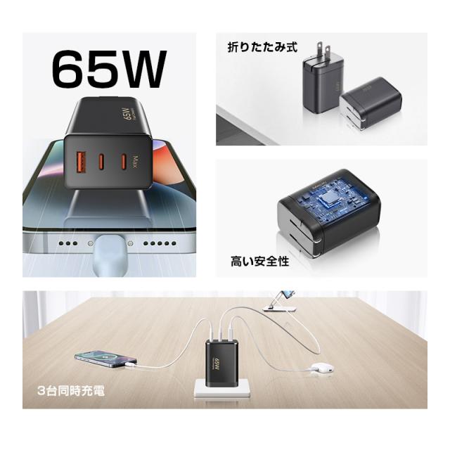 ACアダプター USB充電器 3台同時充電 iPhone17充電 Type-Cポート PD65W急速充電 窒化ガリウム充電器 USB-Aポート 安全保護機能搭載 ノートPC/タブレット ゲーム機充電 安全 安定 軽量 ミニ 便利 防災グッズ PSE認証済 90日安心保証付き【PL保険加入済み製品・安心】