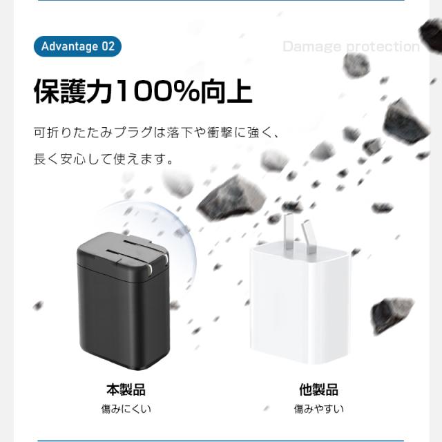 コンパクトサイズに折り畳み式ACプラグを内蔵。使用時はプラグを展開し、収納時は本体にフラットに収まるため、鞄の中で他の電子機器を傷つける心配がありません。軽量設計で、海外旅行時の変換プラグ装着にも対応可能。
