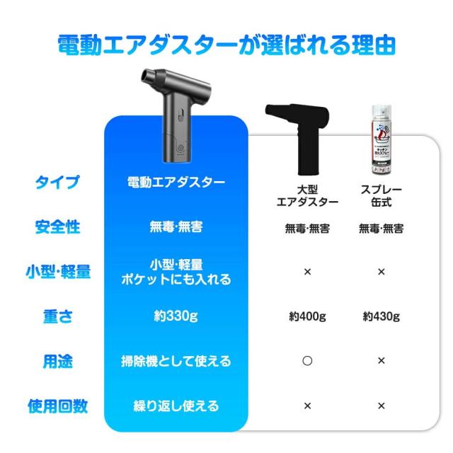 強力な風を噴射して、パソコンやキーボード、家電の細かい隙間に溜まったほこりやゴミを一気に吹き飛ばします。