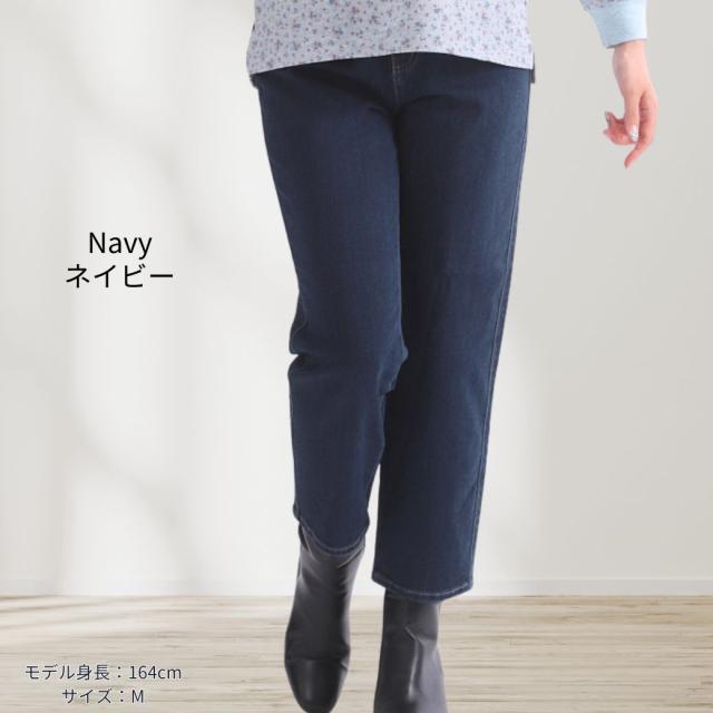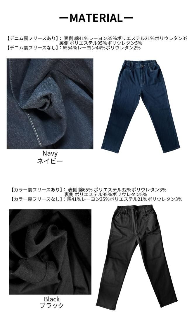 【サイズ】Sサイズ:ウエスト 61cm、ヒップ 89cm、股下 64cm、裾幅 17cmMサイズ:ウエスト 67cm、ヒップ 94cm、股下 64cm、裾幅 17.5cmLサイズ:ウエスト 73cm、ヒップ 99cm、股下 64cm、裾幅 18cmLLサイズ:ウエスト 79cm、ヒップ 104cm、股下 64cm、裾幅 18.5cm【注意事項】製造工程の関係上、各箇所に±2cmほどの誤差があります。上記のサイズはスタッフ計測による平置き実寸サイズです。商品タグ等の表記サイズ値とは異なります。素材 【デニム裏ベロアあり】ネイビー: 表側 綿41%レーヨン35%ポリエステル21%ポリウレタン3% 裏側 ポリエステル95%ポリウレタン5%【デニム裏ベロアあり】ネイビー:綿54%レーヨン44%ポリウレタン2%【カラー裏ベロアあり】ブラック: 表側 綿65% ポリエステル32%ポリウレタン3%裏側 ポリエステル95%ポリウレタン5%【カラー裏ベロアあり】ブラック:綿41%レーヨン35%ポリエステル21%ポリウレタン3%