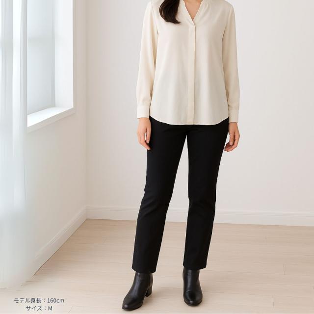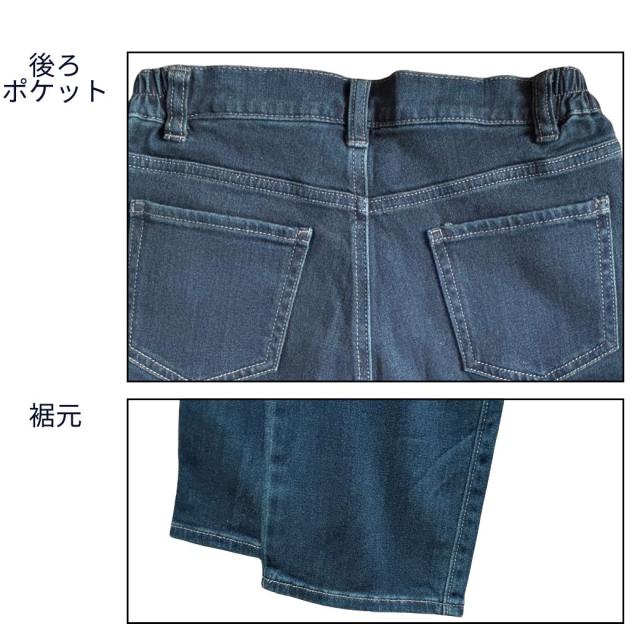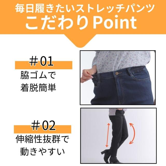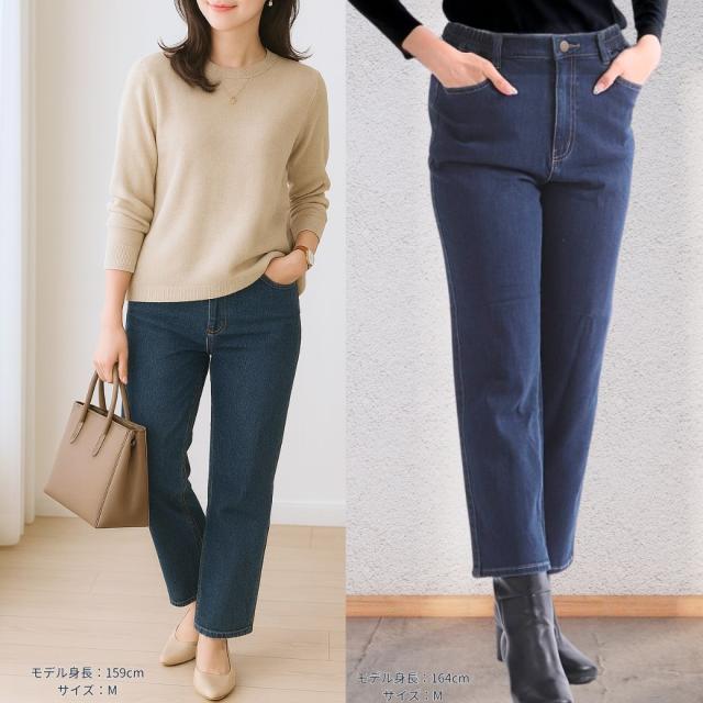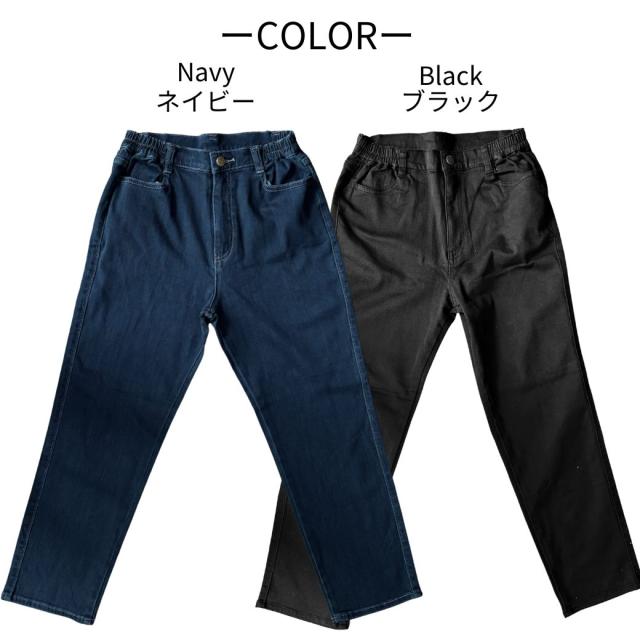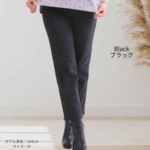 【サイズ】Sサイズ:ウエスト 61cm、ヒップ 89cm、股下 64cm、裾幅 17cmMサイズ:ウエスト 67cm、ヒップ 94cm、股下 64cm、裾幅 17.5cmLサイズ:ウエスト 73cm、ヒップ 99cm、股下 64cm、裾幅 18cmLLサイズ:ウエスト 79cm、ヒップ 104cm、股下 64cm、裾幅 18.5cm【注意事項】製造工程の関係上、各箇所に±2cmほどの誤差があります。上記のサイズはスタッフ計測による平置き実寸サイズです。商品タグ等の表記サイズ値とは異なります。【素材】【デニム裏フリースあり】ネイビー: 表側 綿41%レーヨン35%ポリエステル21%ポリウレタン3% 裏側 ポリエステル95%ポリウレタン5%【デニム裏フリースなし】ネイビー:綿54%レーヨン44%ポリウレタン2%【カラー裏フリースあり】ブラック: 表側 綿65% ポリエステル32%ポリウレタン3%裏側 ポリエステル95%ポリウレタン5%【カラー裏フリースなし】ブラック:綿41%レーヨン35%ポリエステル21%ポリウレタン3%【特徴】寒い季節にも快適でおしゃれを楽しめる、毎日履きたくなる「脇ゴムスリムデニムパンツ」。ウエストの両サイドにゴムを採用しているので、着脱がとてもスムーズで、長時間履いても締め付け感が少なく快適に過ごせます。一般的なデニムパンツのような窮屈さがなく、ストレスフリーな履き心地が魅力。お腹まわりにやさしくフィットするため、体型を選ばず幅広い世代におすすめです。生地には伸縮性に優れたストレッチデニムを使用。しゃがんだり立ち上がったり、日常のあらゆる動きにもしっかり対応します。動きやすさと美しいシルエットを両立したデニムパンツなので、普段のお出かけや買い物はもちろん、旅行や仕事など長時間の着用にも最適です。さらに、裏フリース付きタイプは冷えやすい季節にぴったり。寒い冬でも足元からあたたかさを守り、ぽかぽか快適に過ごせます。裏フリースなしタイプは春や秋に活躍するオールシーズン仕様で、季節に合わせてお選びいただけます。股上は深めの設計なので、しゃがんでも背中が出にくく安心。前フック仕様で脱ぎ履きも簡単だから、毎日の生活で使いやすく、シニア世代の方にも人気があります。脚のラインをきれいに見せてくれるスリムシルエットで、美脚効果も期待できるのが嬉しいポイント。体型カバーをしながらもすっきり見えるので、「きちんと感」と「快適さ」を同時に叶えてくれます。カラーは定番で合わせやいデニム:ネイビーとカラー:ブラックの2色展開。ベーシックな色味なので、カジュアルにもきれいめにもコーディネートしやすく、トップスを選ばず毎日使える万能アイテムです。サイズはS・M・L・LLの4サイズをご用意しており、体型やお好みに合わせてお選びいただけます。「デニムの窮屈さが苦手」「暖かくて動きやすいパンツが欲しい」「きれいに見えるけど楽に履けるパンツが欲しい」という方にぜひおすすめしたい1本です。毎日の暮らしを快適にしてくれる、機能性とデザイン性を兼ね備えたスリムデニムパンツで、冬のおしゃれを楽しんでみませんか?【注意事項】■商品の撮影には最大限注意を払っておりますが、閲覧時のモニター環境によりましては実際の商品と若干違うお色味に映ることもございます。