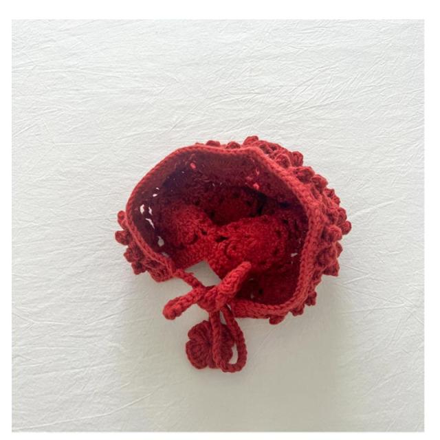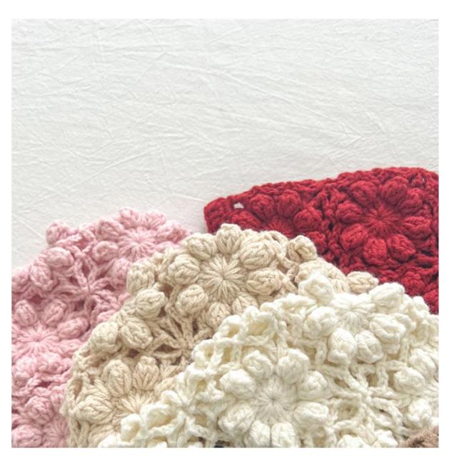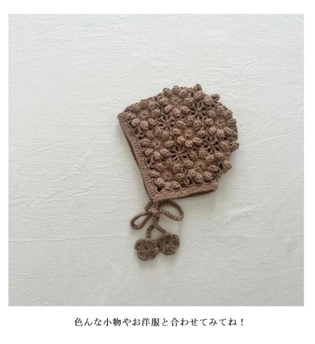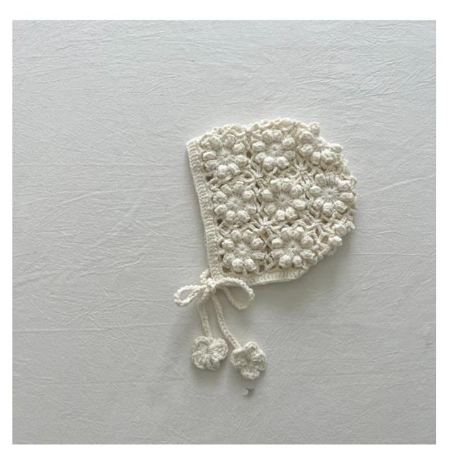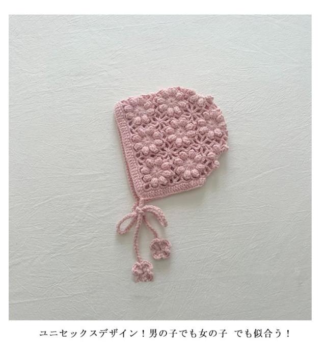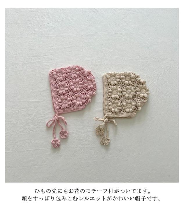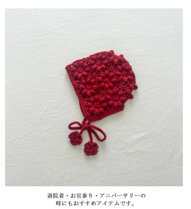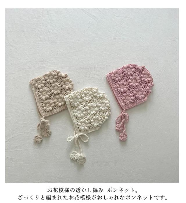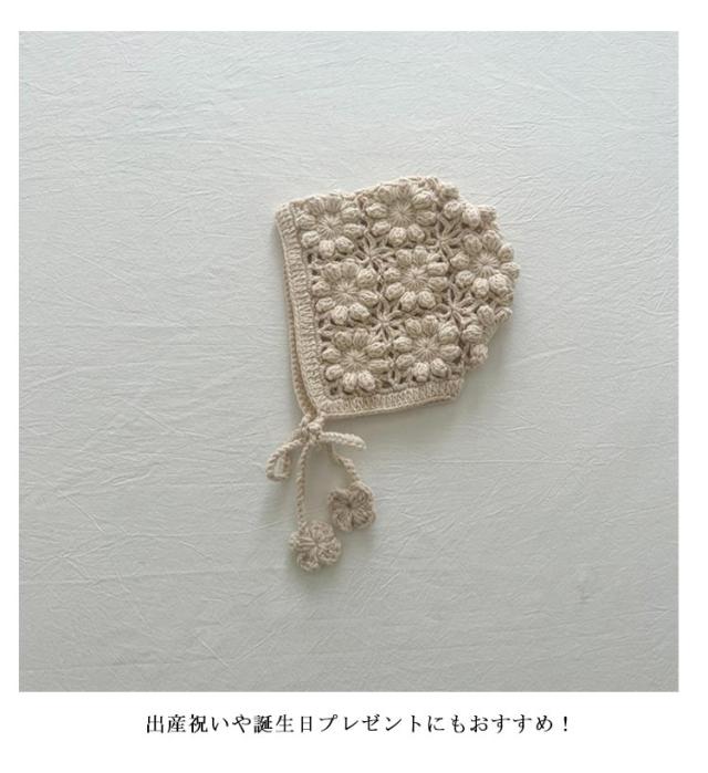 | 透け編みがとっても可愛いフラワーニットボンネット。透かし編みがおしゃれです。 お花模様の透かし編み ボンネット。ざっくりと編まれたお花模様がおしゃれなボンネットです。 ひもの先にもお花のモチーフ付がついてます。頭をすっぽり包みこむシルエットがかわいい帽子です。 退院着・お宮参り・アニバーサリーの時にもおすすめアイテムです。 出産祝いや誕生日プレゼントにもおすすめ! ユニセックスデザイン!男の子でも女の子 でも似合う! 色んな小物やお洋服と合わせてみてね! | |