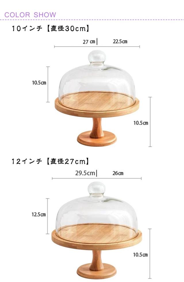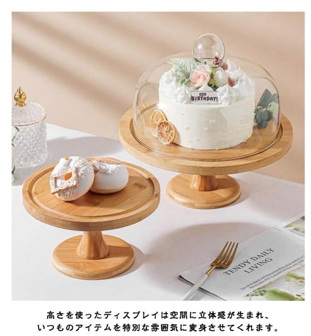 | ガラス蓋つきの木製ケーキスタンド。天然木の木目が美しい一品です。【直径30cm】&【直径27cm】 ナチュラルでシンプルなデザインなので、どんなテーブルコーディネートとも合わせやすく。 ガラスのドーム蓋をかぶせれば、乾燥から食材をしっかり守ります。 高さを使ったディスプレイは空間に立体感が生まれ、いつものアイテムを特別な雰囲気に変身させてくれます。 ケーキ以外にもお菓子やパンなど置くのもおすすめです。 上品な佇まいで、テーブルを特別な雰囲気に変化させてくれます。 コーヒータイムや来客時など少し気分を変えたい時にもおすすめです。 | |