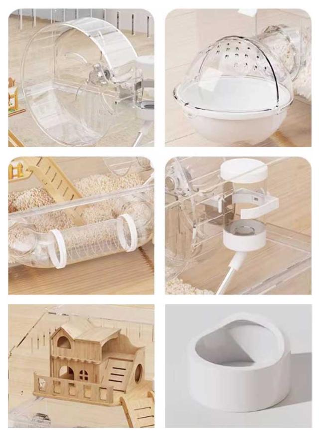 | 広々アクリルケージでハムスターの楽園を!ハムスターケージ。 お手入れ簡単なフルセットだから、初心者もすぐスタート。 ケージ本体、給水ボトル、餌入れ、ハウス、お風呂などで構成されています。 高級ヴィラのような二階建てのデザインで、ペットが快適に過ごせるスペースを確保しています。 静かで回りができるまわし車付いて、ハムスターの運動不足を解消することができます。 どの角度からでもペットの動きが見え、楽しい観察時間を提供します。 ペットの遊びや休息を見守ることができます。丸まって眠っているハムちゃんがうっすら見えて、とてもかわいいです。 ケージの屋上と両側は通気穴がたくさん付き、通気性抜群で、風通しが良い、蒸し暑さを防ぎ、ハムスターを快適にする。 開放感が あり通気性に優れているため、湿気、ニオイや熱がこもりません。 ケージはバックルで固定され、簡単分離ができます。 引っ越しや収納・運送にも便利です。一回で木屑やゴミを出すことできます。衛生的な住まいを提供し、ペットの健康をサポートします。 | |