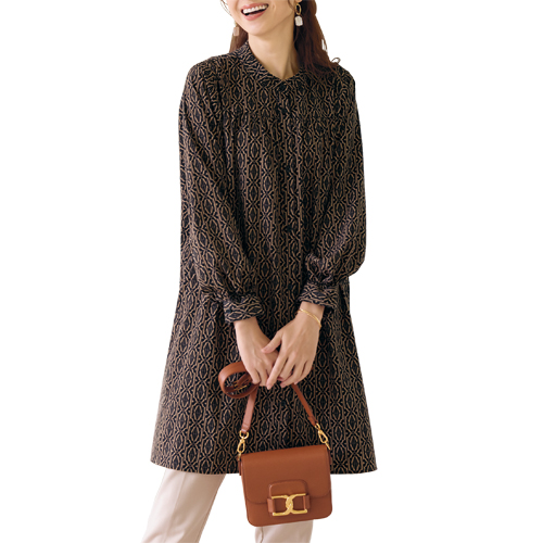 ヨーク切替えプリント シャツチュニック ブラック ブラウン チュニック ブラウス 長袖 幾何学模様 レディース 婦人服 ミセス シニア 女性 大人 幾何柄 レトロ 上品 フェミニン シニアファッション 40代 50代 60代 70代 80代 90代 母の日 お母さん おばあちゃん 秋物 冬物 秋冬 ヨーク切り替え