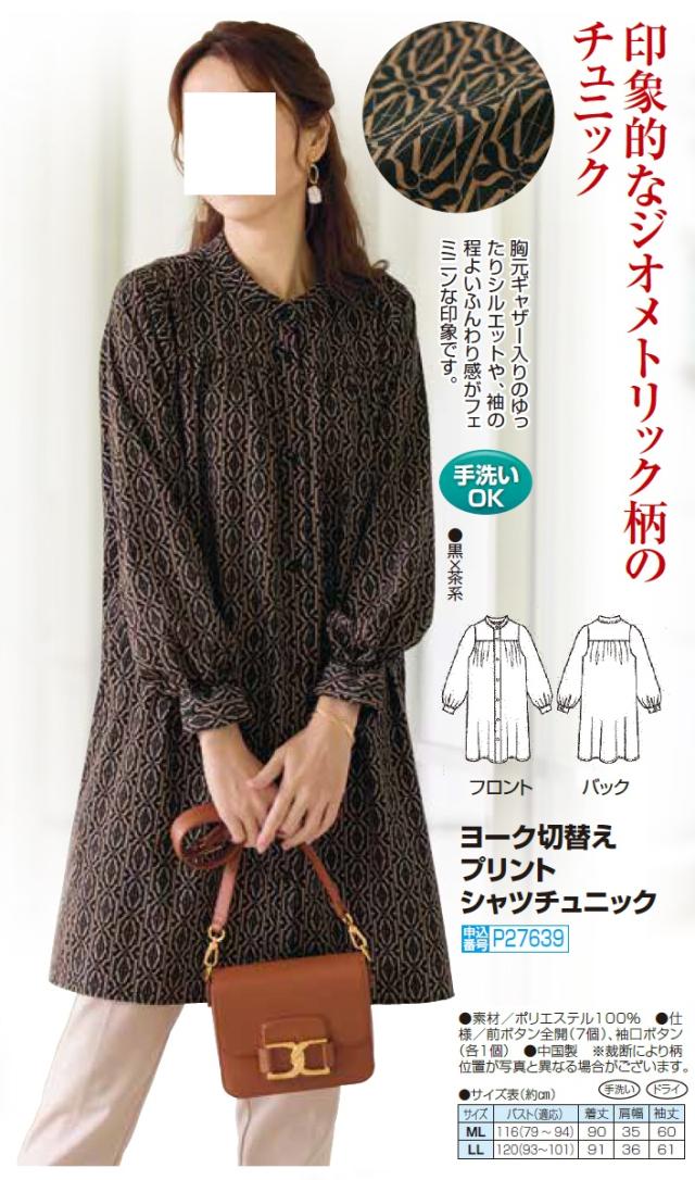 ヨーク切替えプリント シャツチュニック ブラック ブラウン チュニック ブラウス 長袖 幾何学模様 レディース 婦人服 ミセス シニア 女性 大人 幾何柄 レトロ 上品 フェミニン シニアファッション 40代 50代 60代 70代 80代 90代 母の日 お母さん 秋冬 nss p27639