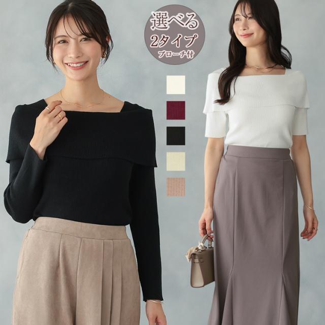 女性らしさが引き立つオフショルダーニット。五分袖ニットと長袖ニットの2タイプ。オフショルダーが気になる二の腕をカバーしてくれます