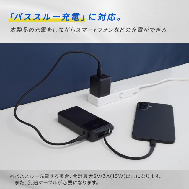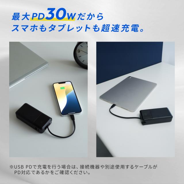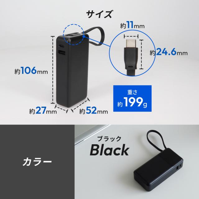 USB Type-Cケーブル一体型 モバイルバッテリー デジタル表示搭載 10000mAh 最大PD30W対応 USB Type-C入出力 USB Type-A出力