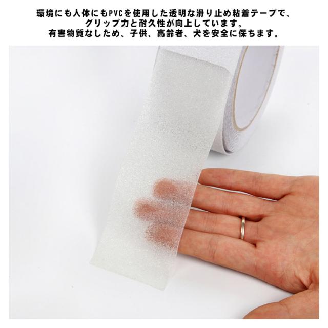 | 環境にも人体にもPVCを使用した透明な滑り止め粘着テープで、グリップ力と耐久性が向上しています。有害物質なしため、子供、高齢者、犬を安全に保ちます。 すべり止め顆粒が入っている、滑りを抑え、安心してご使用頂けます。 タイル、大理石、その他の滑らかな素材および気泡や隙間がない素材に適用です。使いたい場所にあわせて、はさみで自由に裁断ことができます。 テープは完全に粘着性があり、わずか数秒で表面にすばやく貼り付けられます。防水性があり、シャワーや浴槽のような濡れた環境にも置くことができます。 駐車場、ホテル、病院、学校、駅、オフィスビル、階段、トイレ、浴室、などには大活躍。滑りやすくなった階段・フロアなどのスリップ事故の防止にお役立てください。 | |