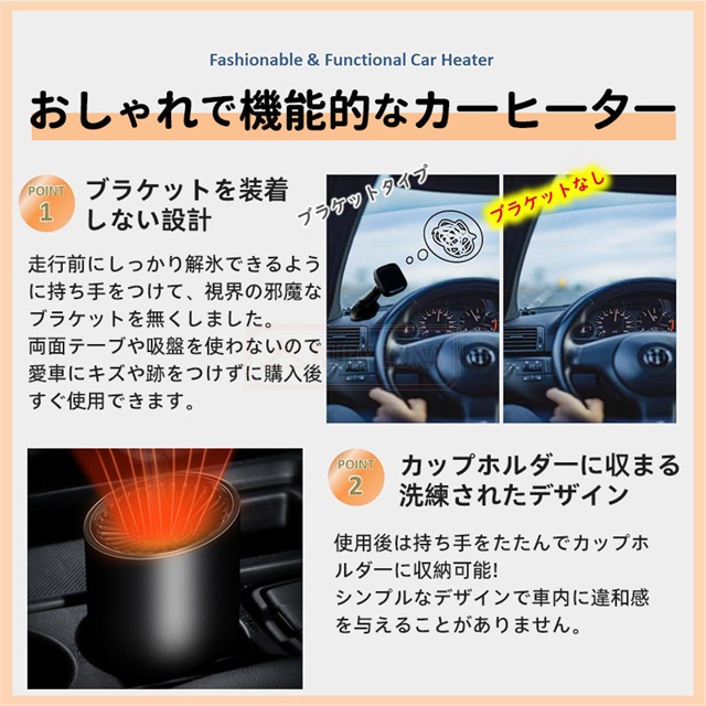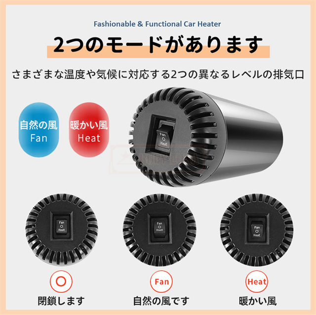 | 【カップ型カーヒーター】 | ◆このカップ型カーヒーターは、デフロスター・デフォギング、空気清浄だけでなく、自然風や温風機能にも適しています。スイッチを交換するだけで、必要に応じて、暖風または自然風がすぐに現れます。 |