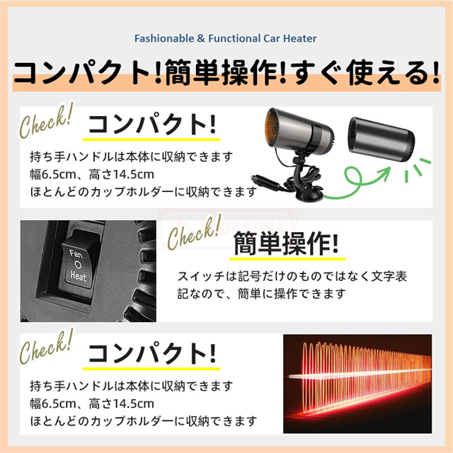 | 【多用途&注意】 | ◆ヒーターは、車、風防、サイドウィンドウ、リアウィンドウの霜、霧、霧を素早くきれいにするように設計されており、明確な運転視界を提供し、この寒い冬の暖かい運転を楽しむことができます。(パワー150W以下の車種には不対応) |